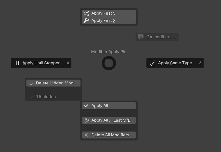 Toggles pie menu: Pie menu for toggling very common modifiers such as the "last" mirror in your stack, arrays, toggling all "union" booleans, all "difference" booleans, toggling bevel modifier + bevel weight (if there are any), etc